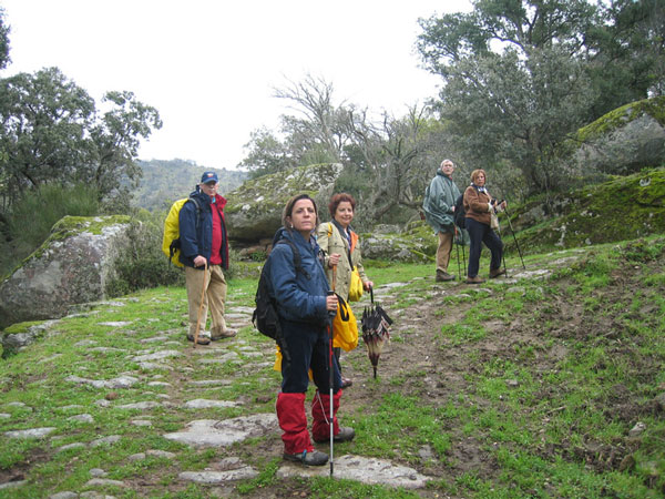 Está bien definido y discurre entre cerramientos de paredes de piedra hasta una cancela (pintada de verde y que abre a la izquierda). Pasada esta cancela, el camino está casi perdido. Sirva de orientación que deberemos dejar unos abrevaderos a la izquierda, una laguna a la dcha. y una majada a la dcha. En este tramo se pasan varia cancelas. Pronto llegaremos hasta una calzada empedrada que discurre entre paredes, con la que comienza el ascenso hasta el Santuario.